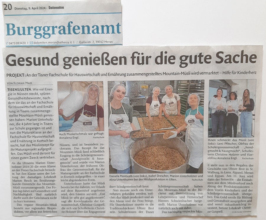 Gesund genießen für die gute Sache 08.04.2024 | News | Projekte An der Tisner Fachschule für Hauswirtschaft und Ernährung zusammengestelltes Mountain-Müsli wird vermarktet - Hilfe für Kinderherz Bildergalerie Gesund genießen