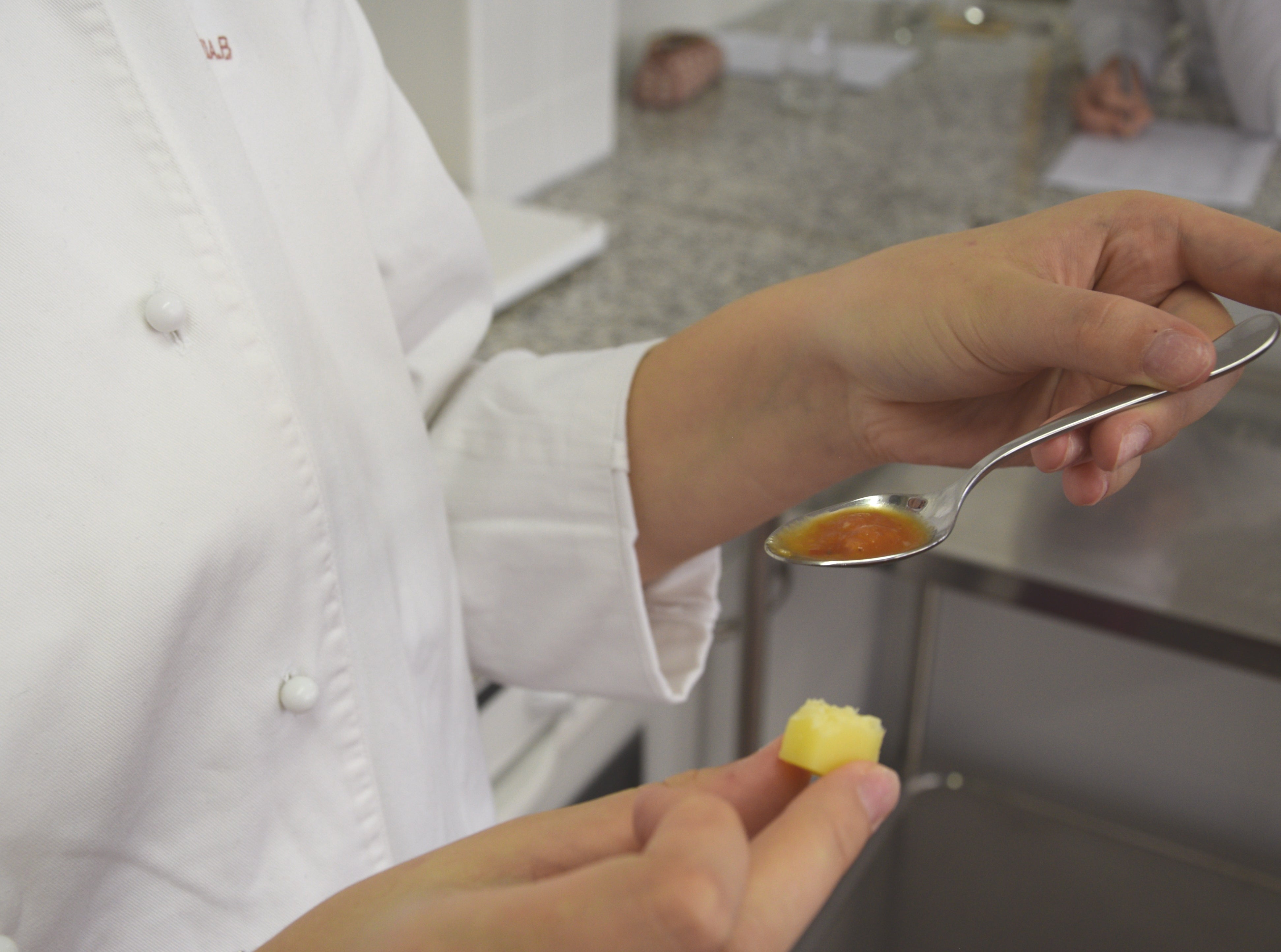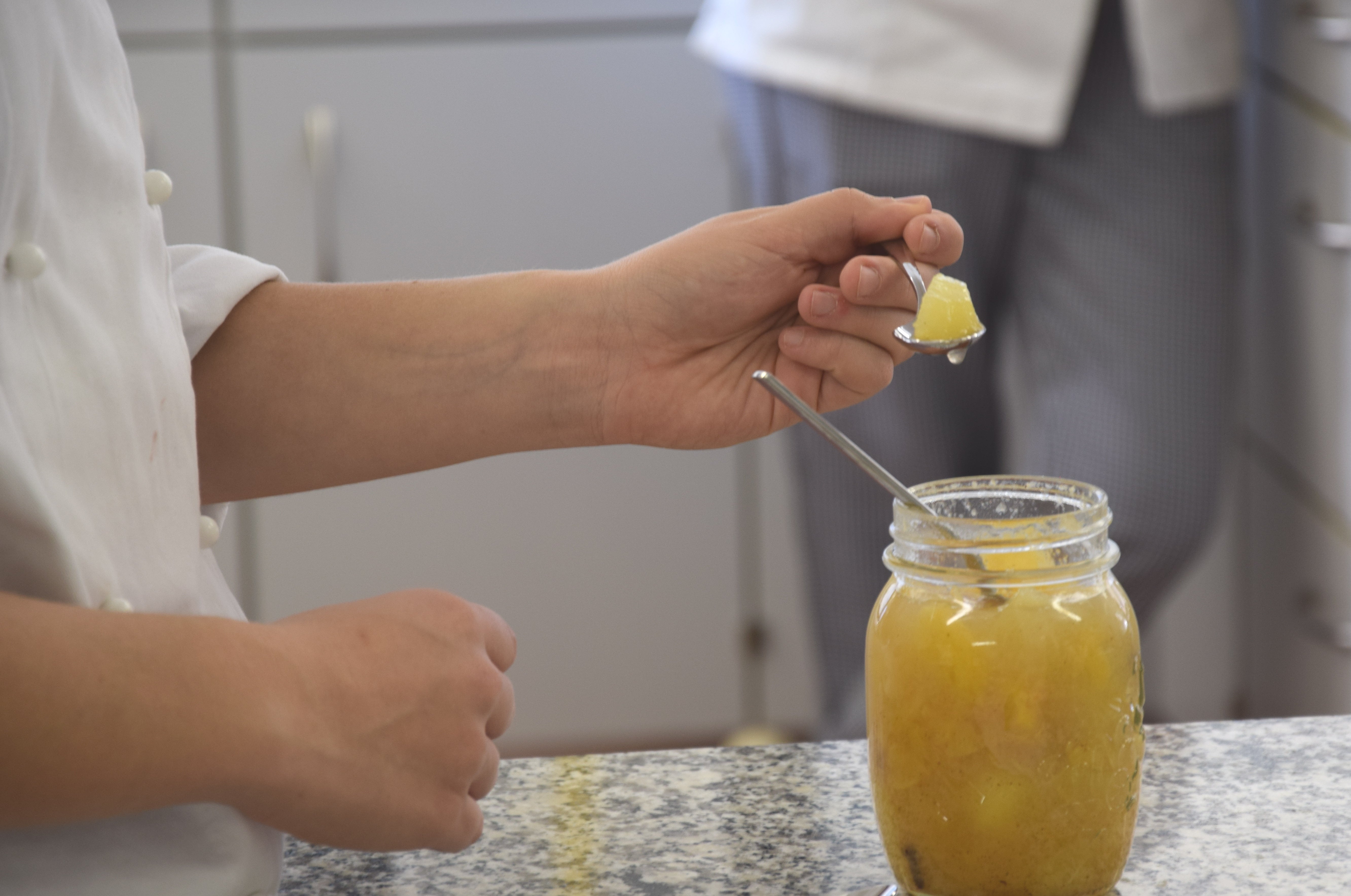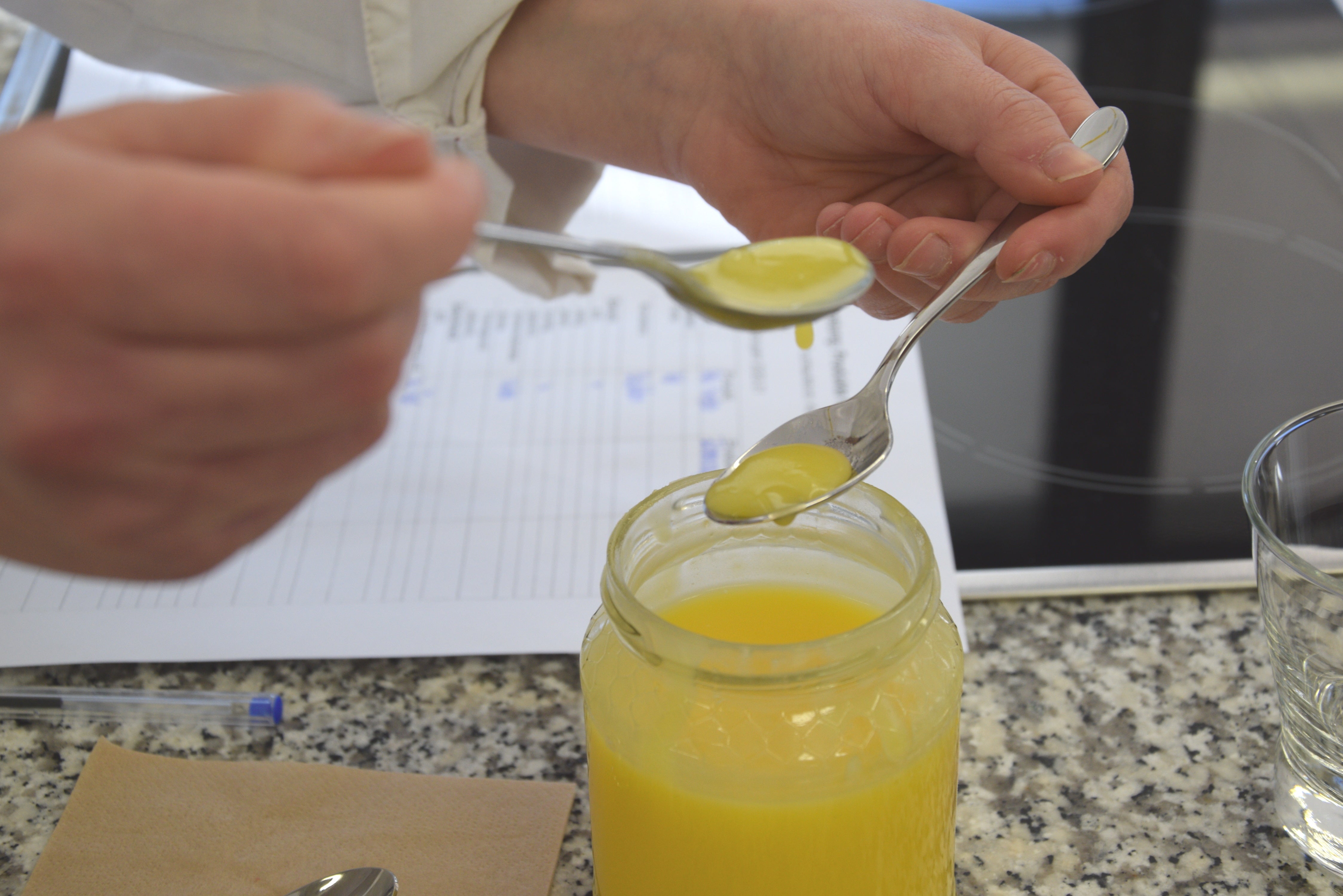 Nach der Planungsphase sind die Schülerinnen der vierten Klasse mitten in der Umsetzung ihres Hofladens: In der Küche werden im Fach Gemeinschaftsverpflegung die ersten Produkt-Prototypen professionell verkostet und akribisch unter die Lupe genommen. Würde ich dieses Produkt so kaufen oder bedarf es einer Abänderung? Andere Produkte werden bereits hergestellt, wie Fruchtaufstriche, Sirupe, Chutneys oder Liköre.