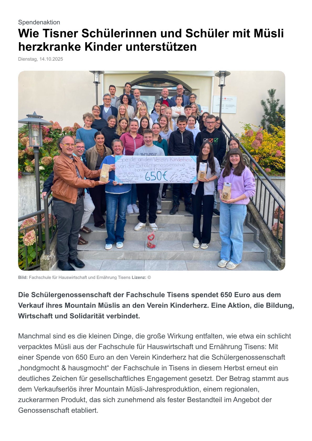 Die Schülergenossenschaft „hondgmocht & hausgmocht“ der Fachschule für Hauswirtschaft und Ernährung Tisens spendete letzthin einen Erlös ihrer Mountain Müslis – Jahresproduktion dem Verein Kinderherz.