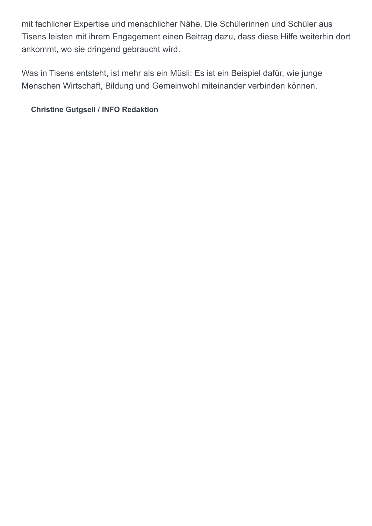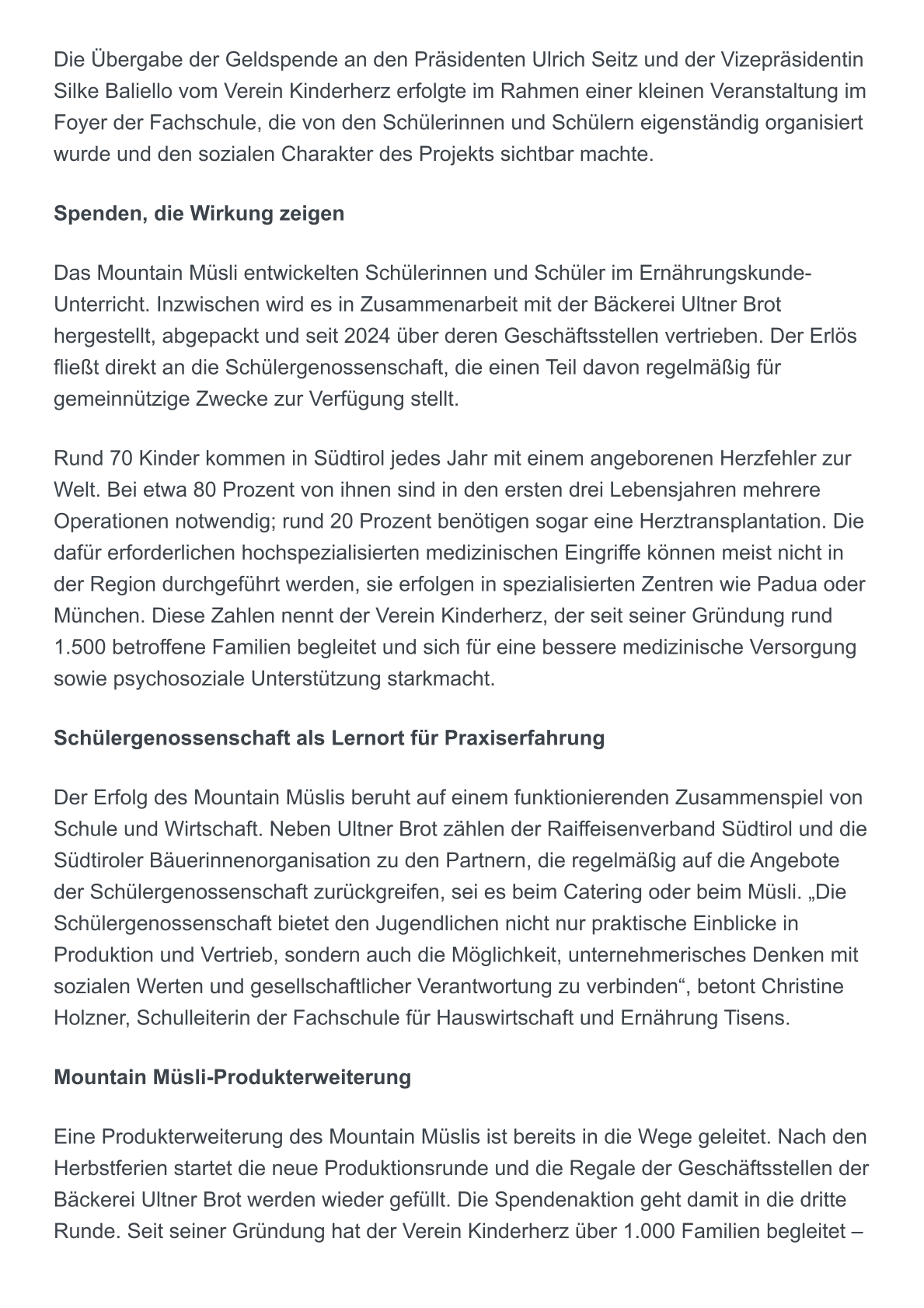 Das Mountain Müsli ist - gleich dem Catering - auf dem guten Weg, ein Klassiker unter den Angeboten der Tisner Schülergenossenschaft zu werden. Das zuckerarme und biologisch regionale Produkt wird von den Mitgliedern der Schülergenossenschaft bei Ultner Brot produziert, abgepackt und über die Ultner Brot – Geschäftsstellen vertrieben. Den Verkaufserlös erhält die Schülergenossenschaft, die ihrerseits einen Großteil davon dem Verein Kinderherz spendet.