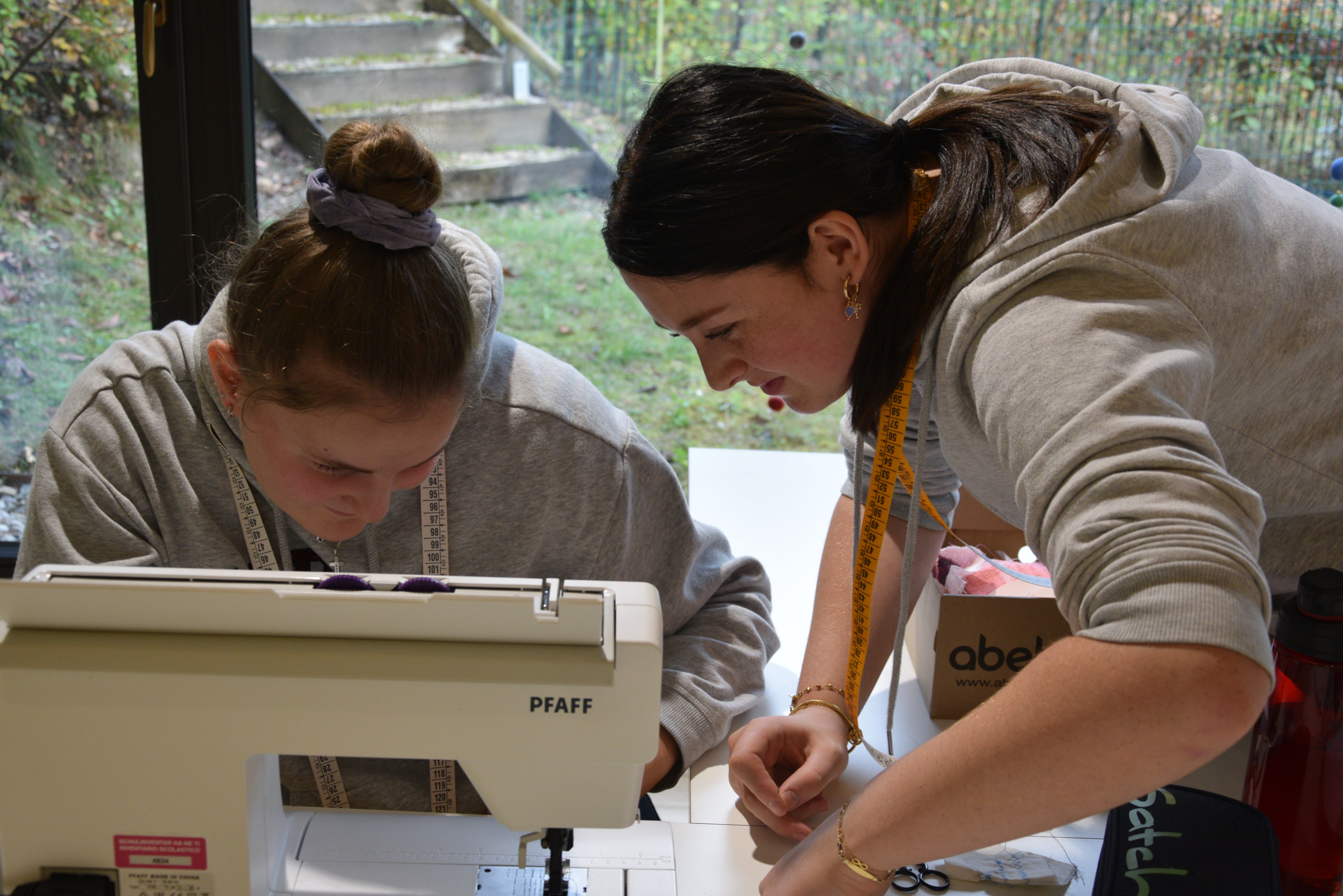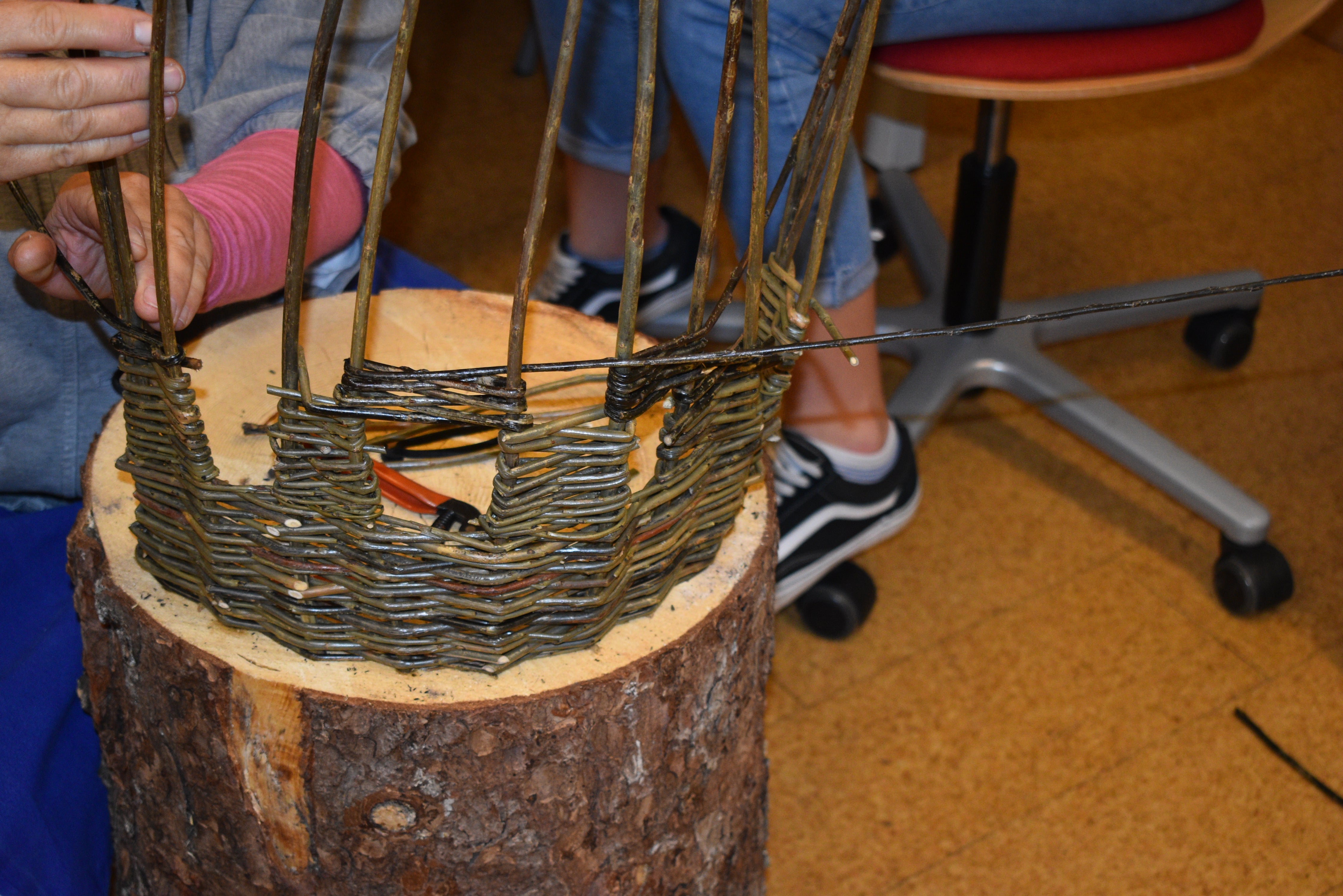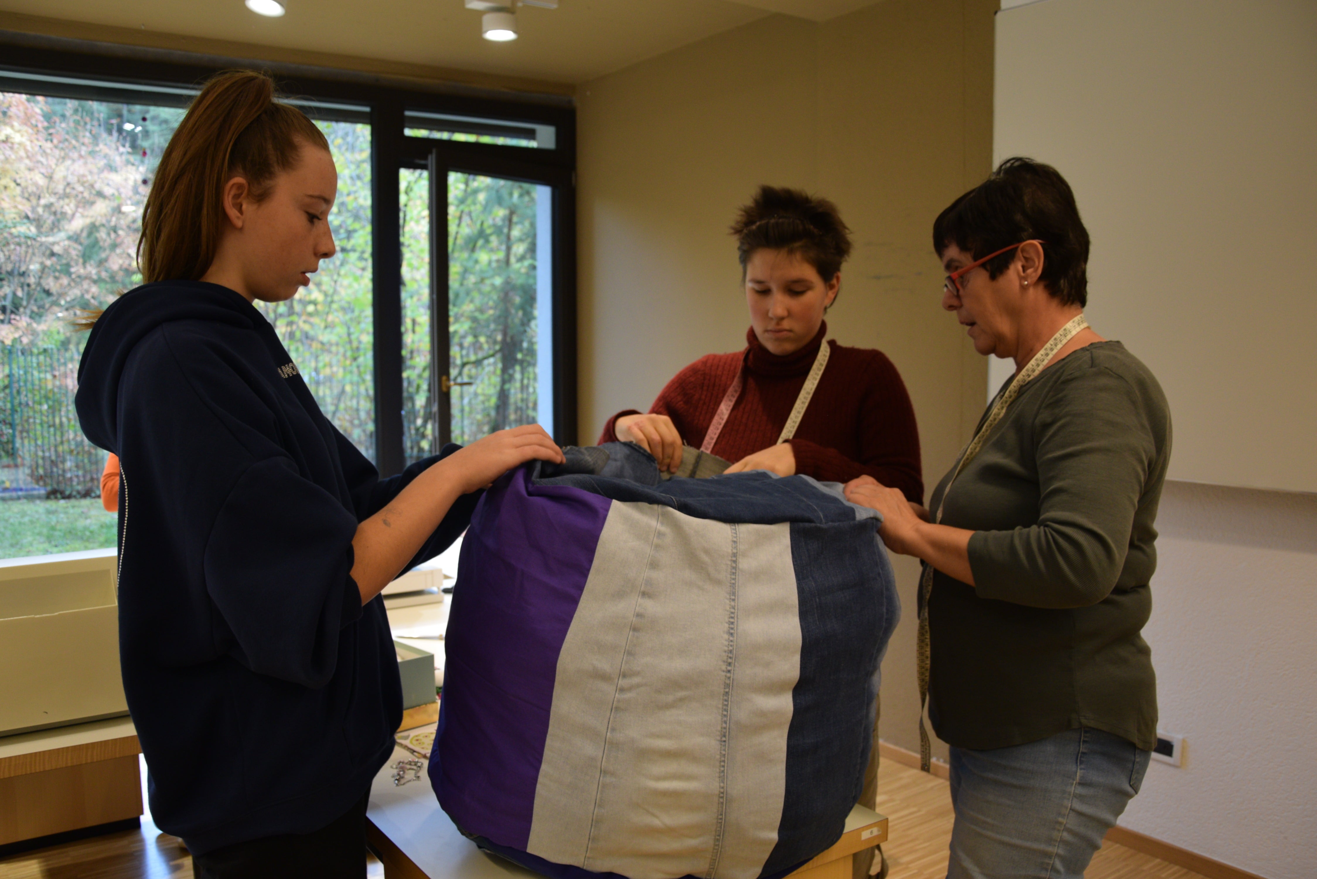 Unter fachgerechter Anleitung der Referentin Elisabeth Taibon kreierten die Schüler:innen geflochtene Baumstamm-Stühle. Dazu nähten sie nachhaltige Kissen aus gebrauchten Baumwollstoffen.