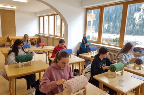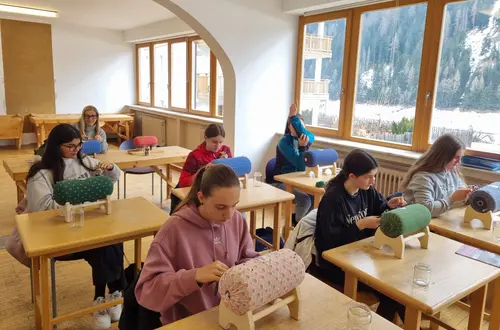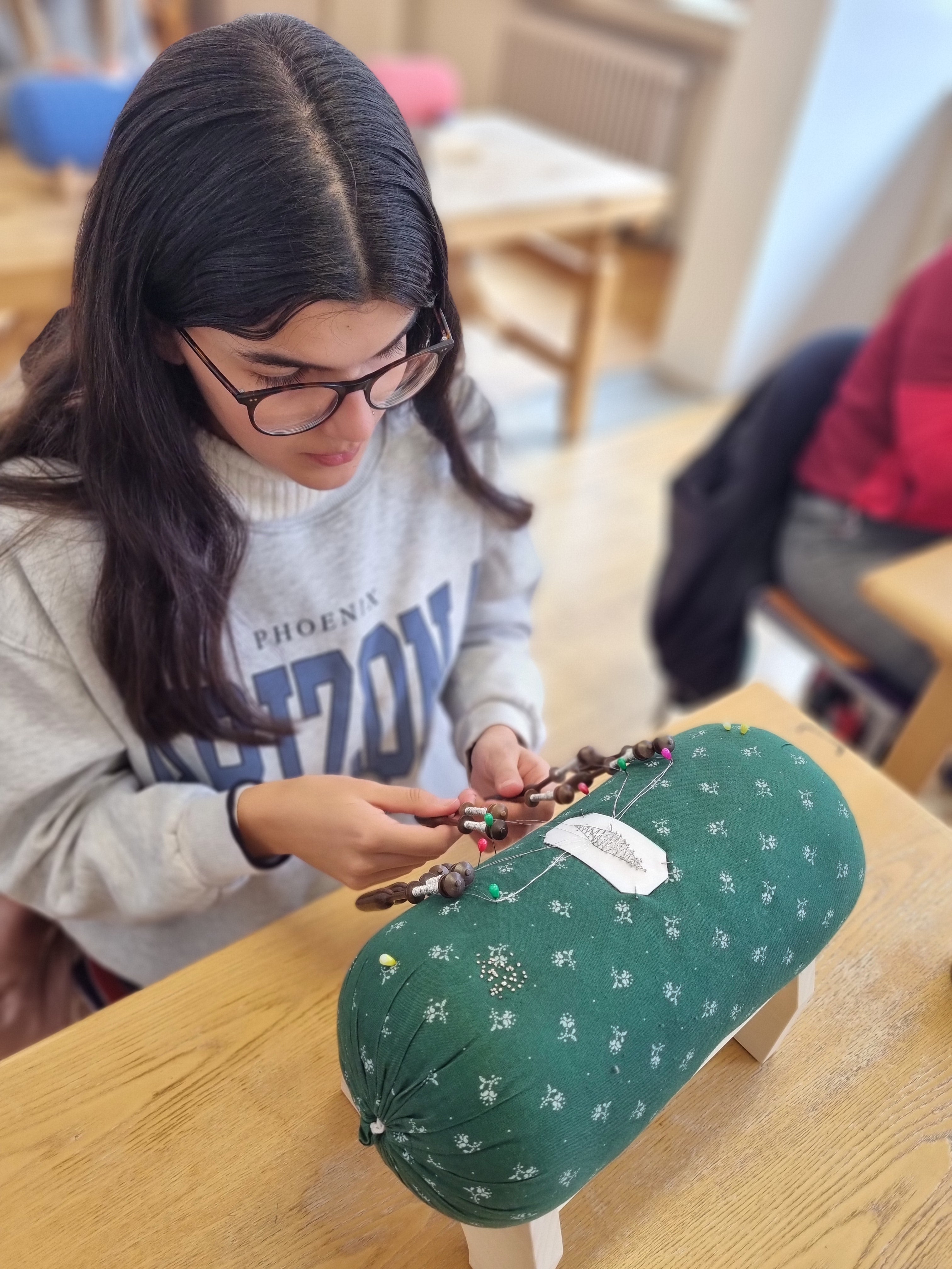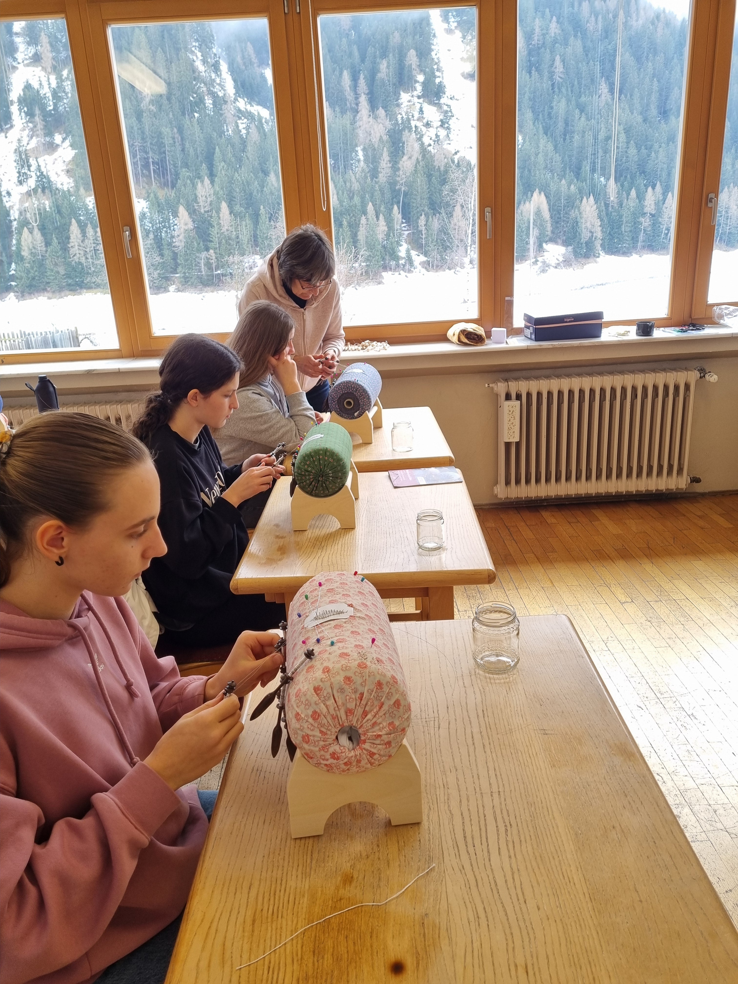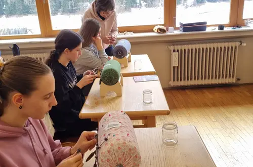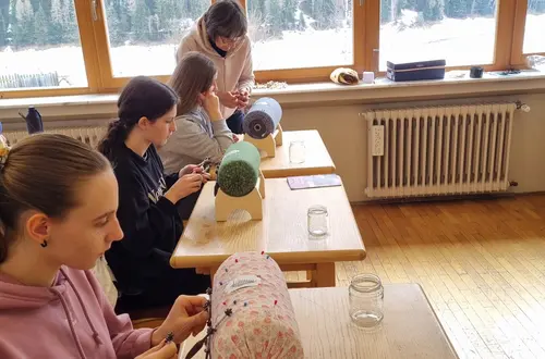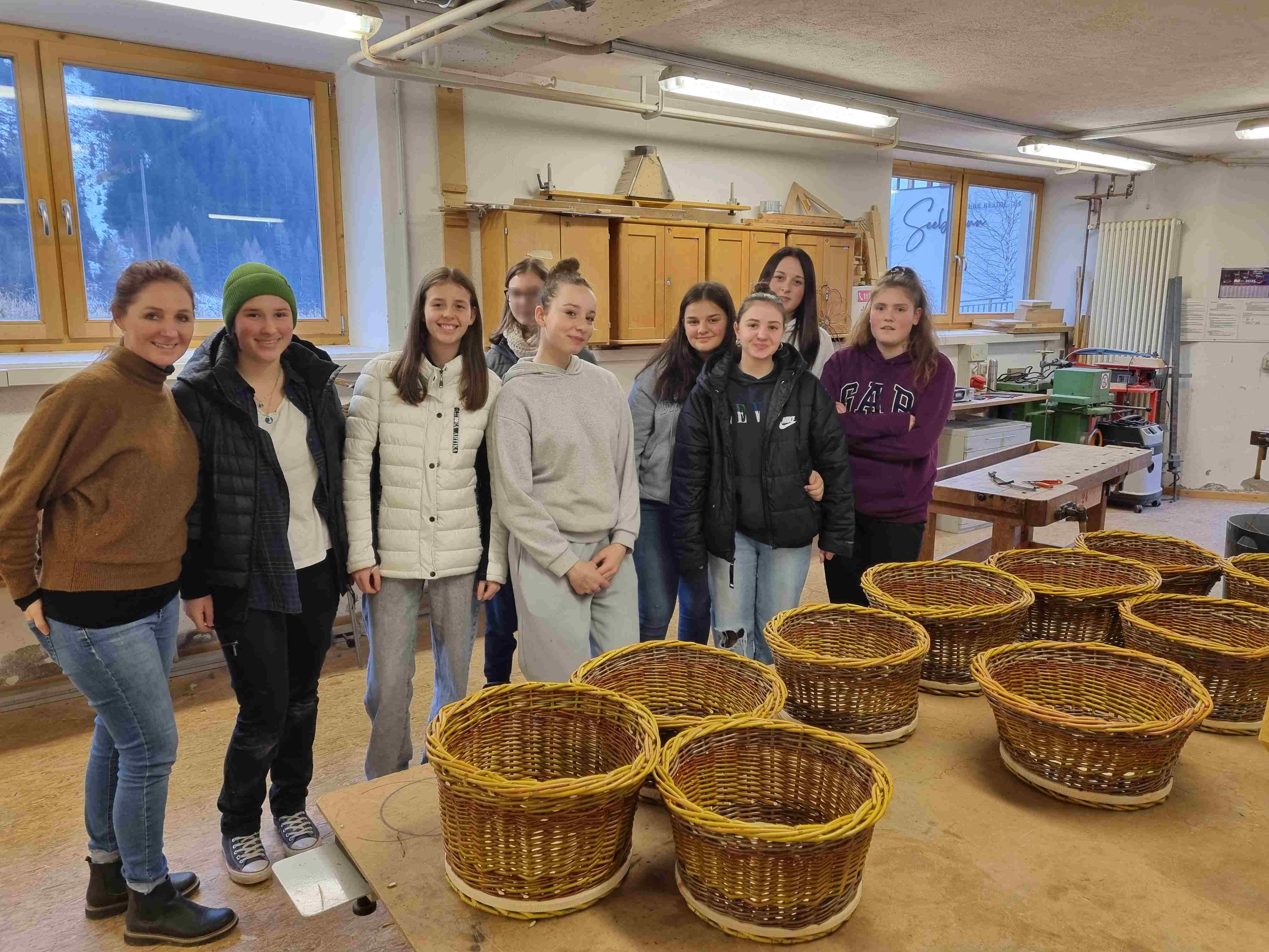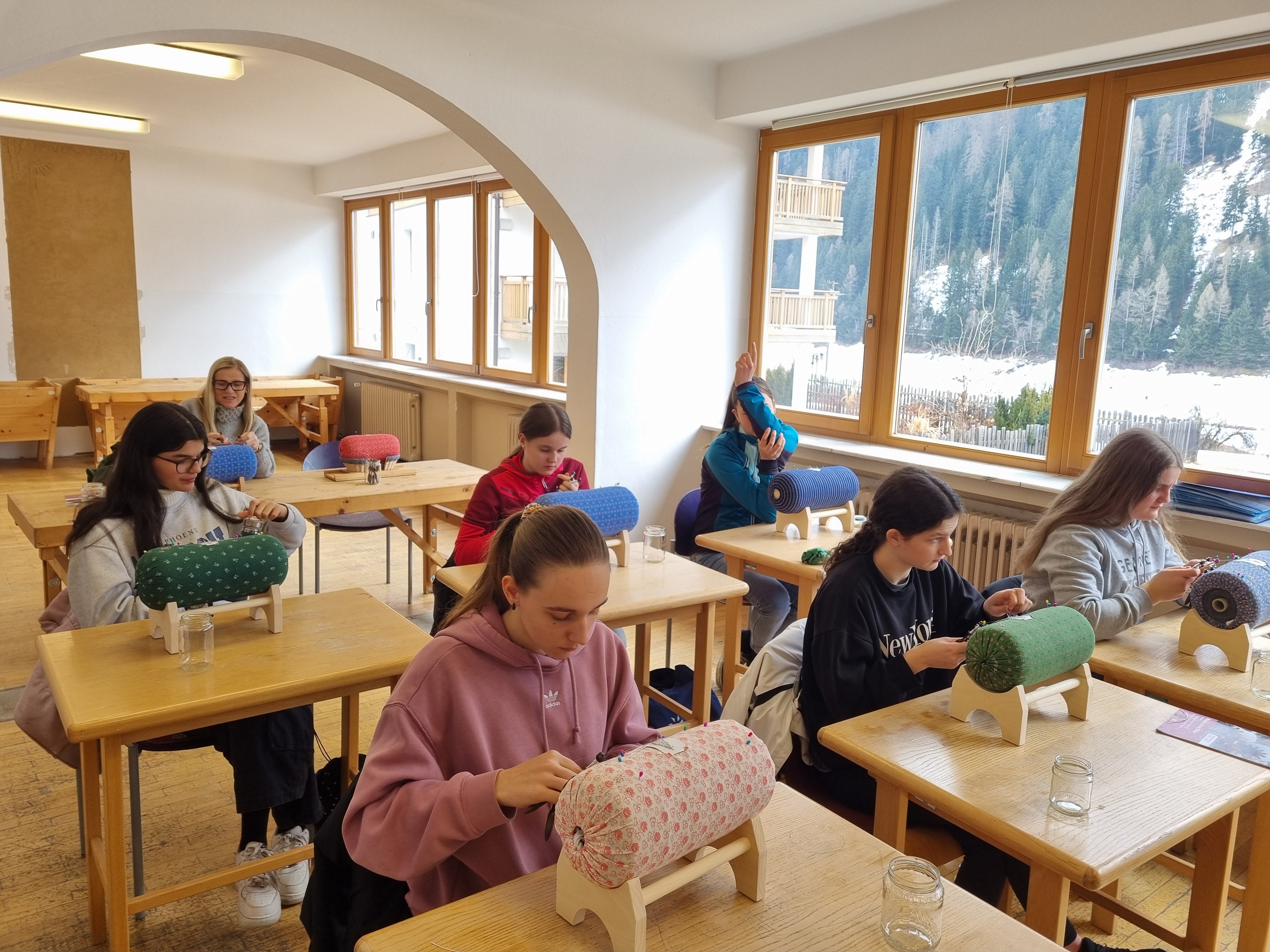 Die Klasse besuchte einen Drechsler und konnte ihm bei der Herstellung einer Holzschüssel zusehen. Das Hotel Tirolensis in Prissian wurde besichtigt und dabei besonderes Augenmerk auf die Einrichtung und Gestaltung der Zimmer und des Speisesaals gelegt. Mit der Spinnrunde Prissian konnten die Schüler:innen aus Wolle kleine Dekos (z.B. Pilze) filzen.