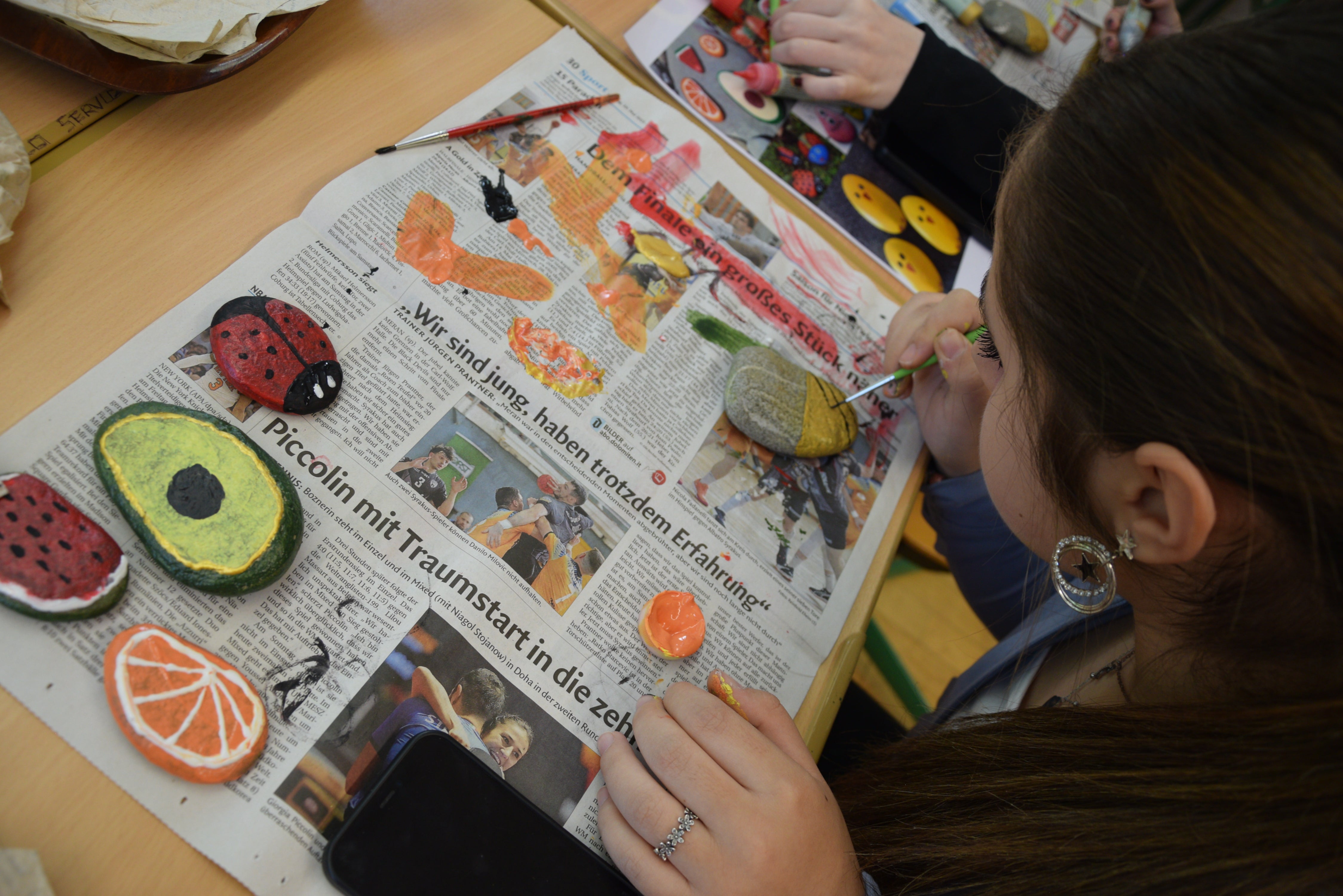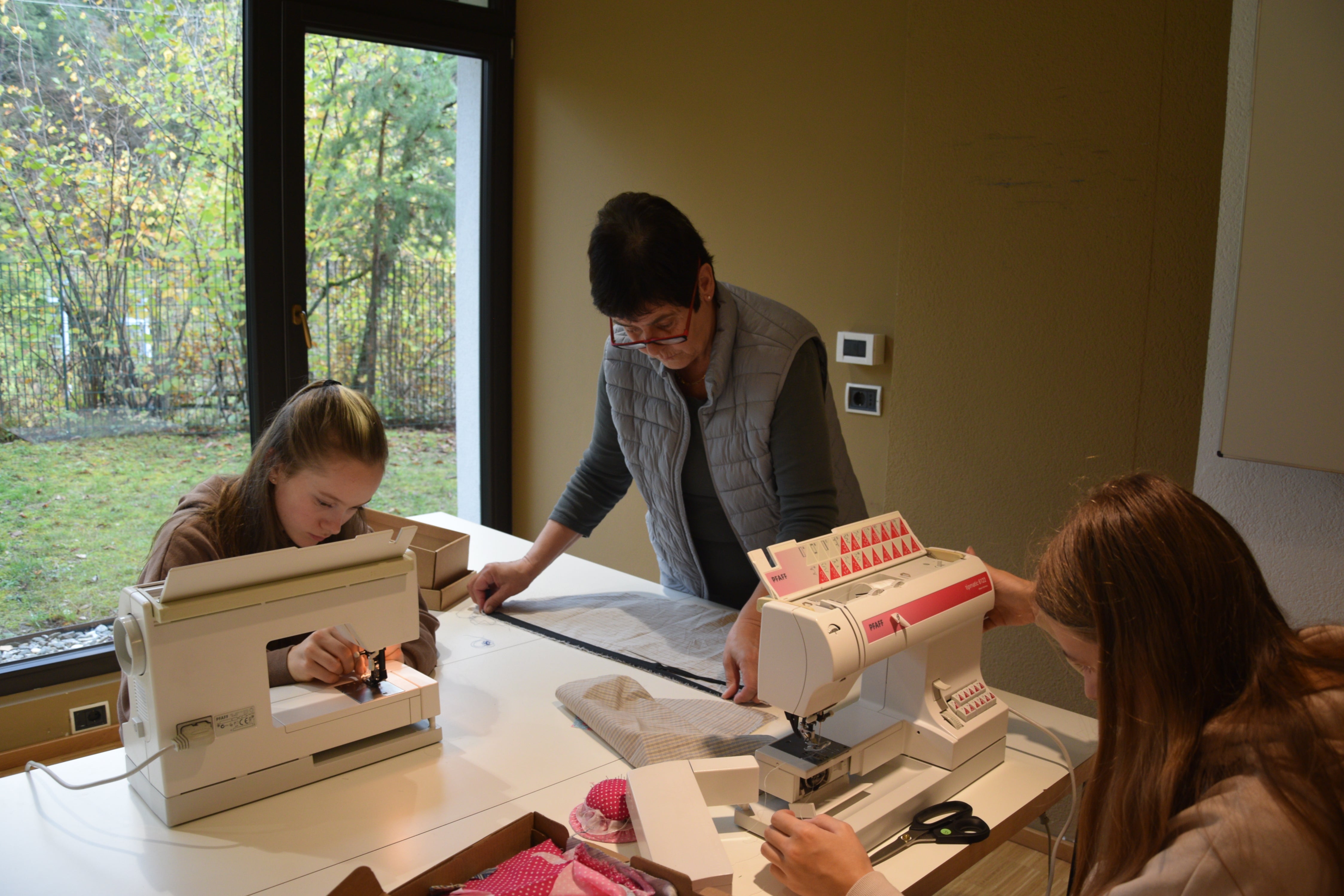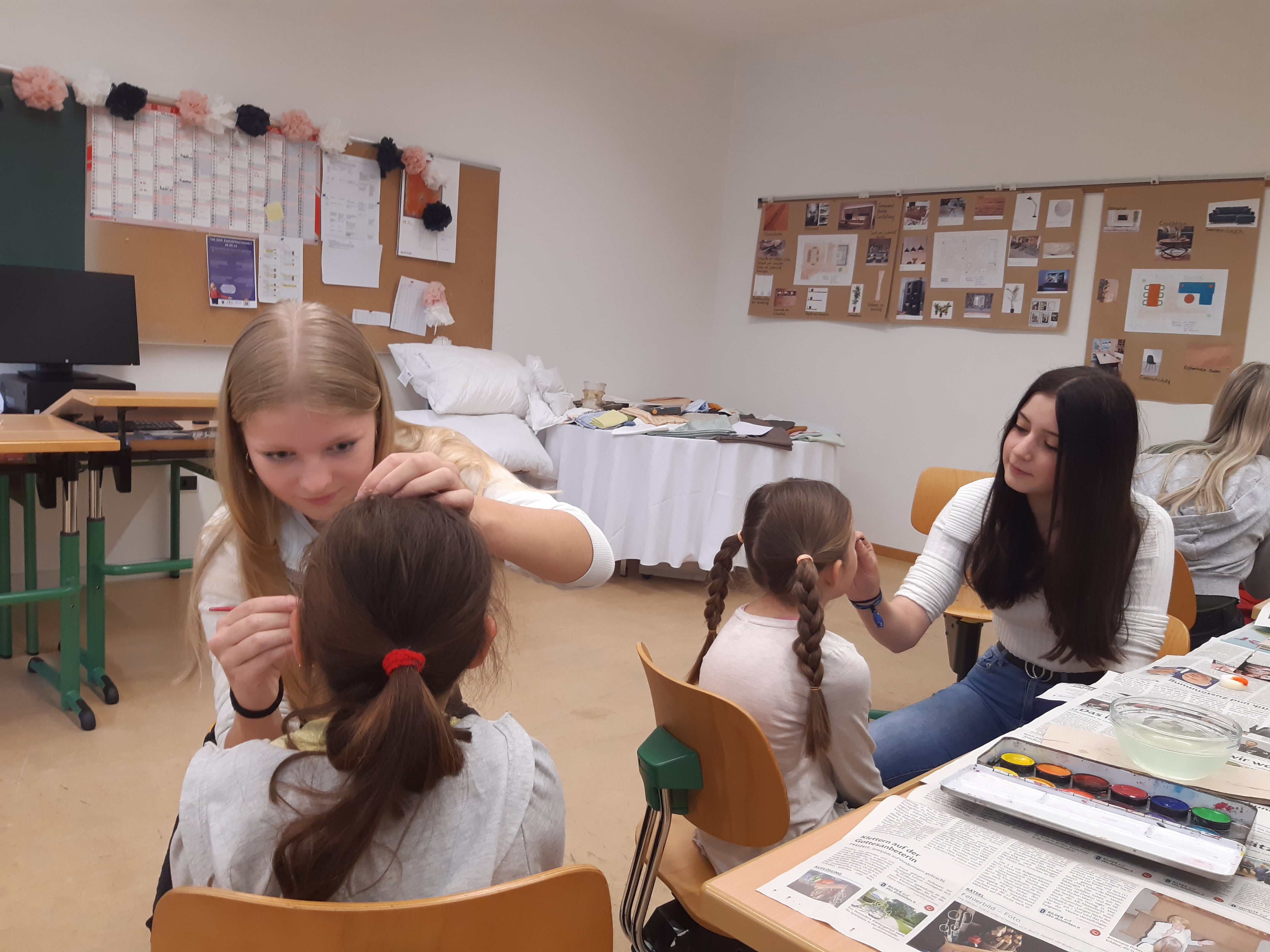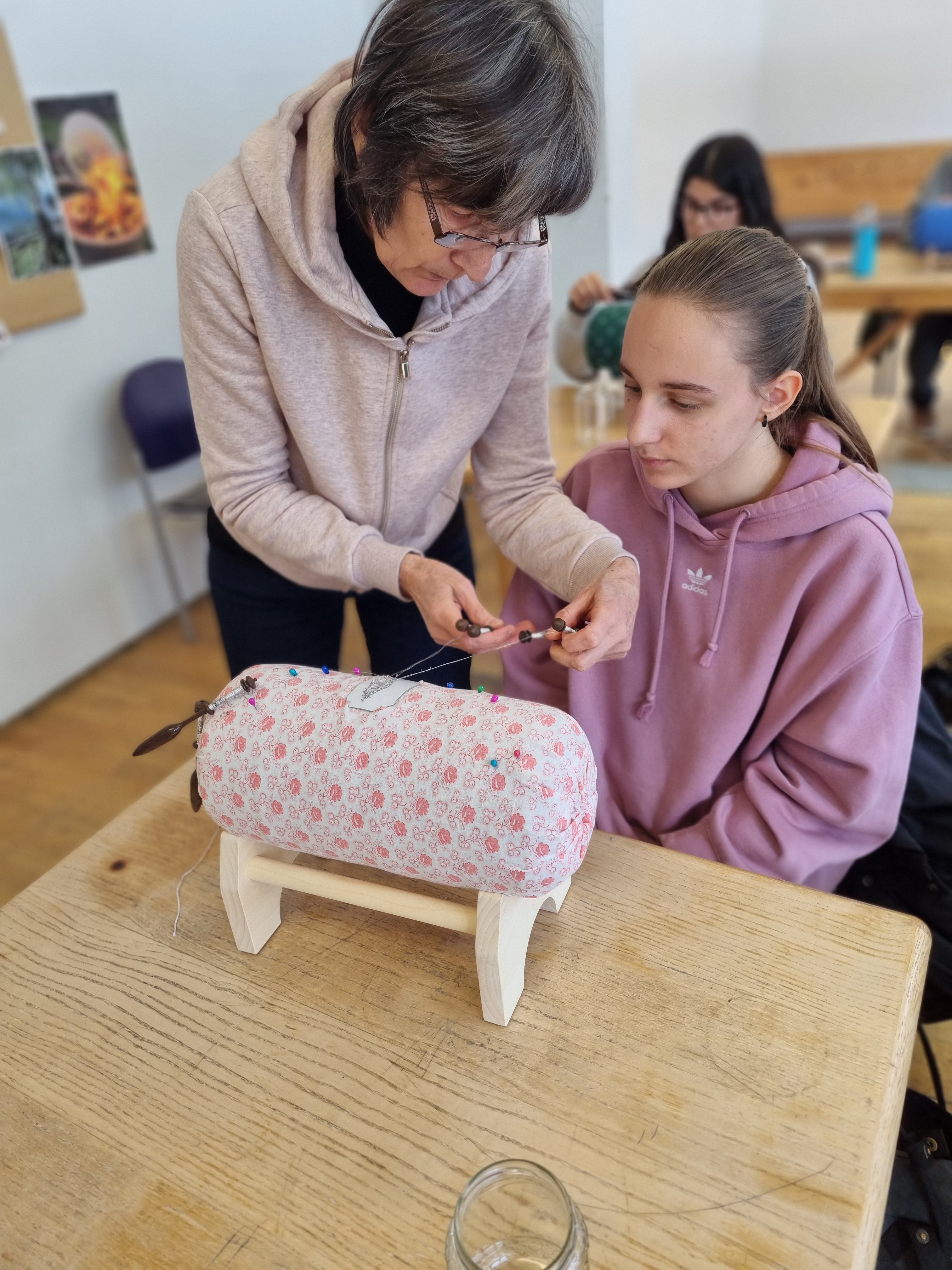 Die Schüler:innen konnten sich bei verschiedenen Stationen zuteilen: Seifen und Salben herstellen, Mosaikkugeln gestalten, Sticken lernen und üben. Das kreative Arbeiten machte allen sichtlich Spaß.