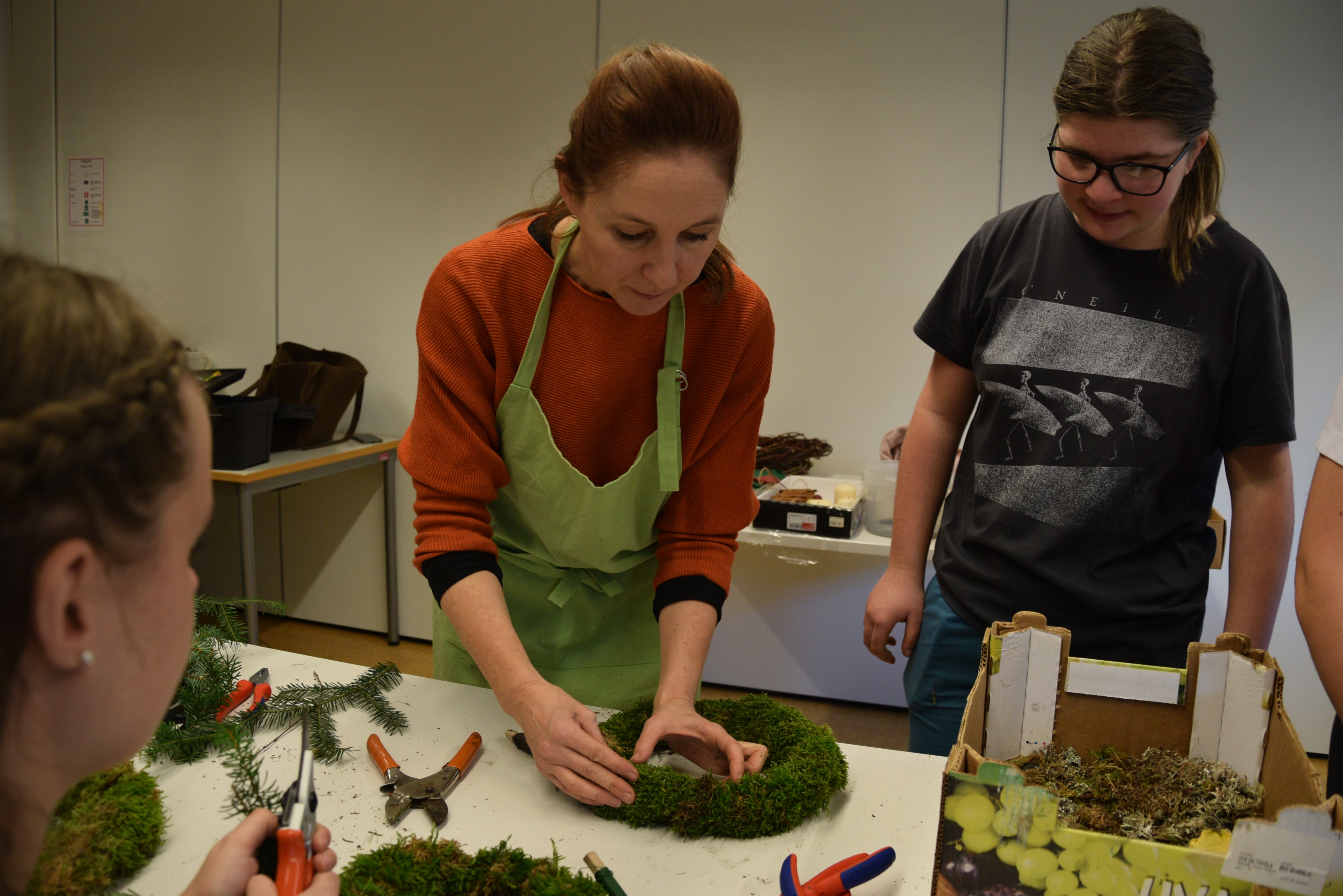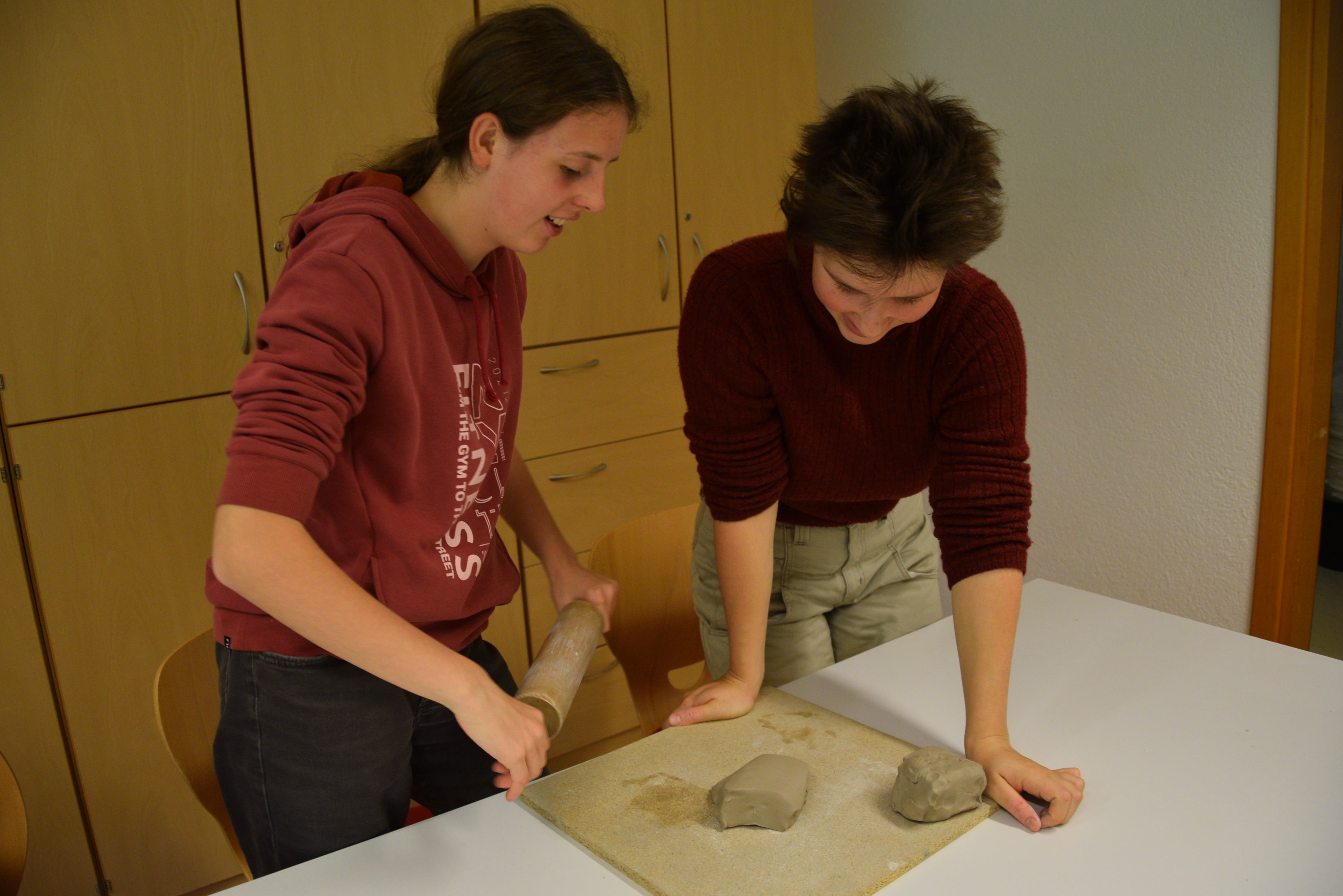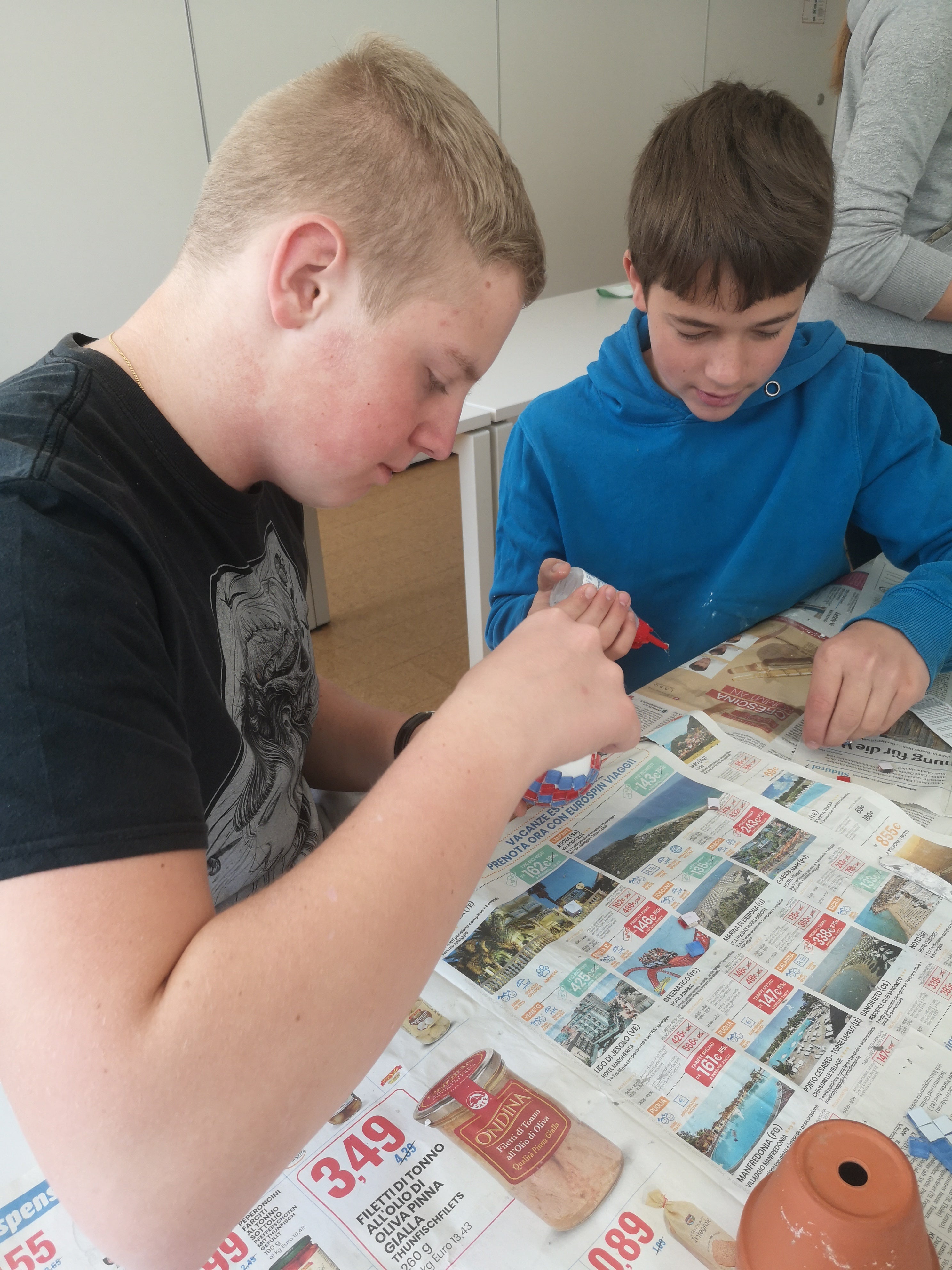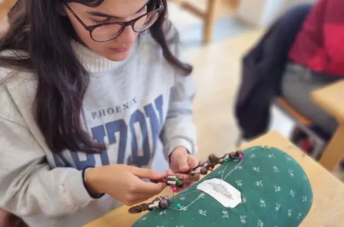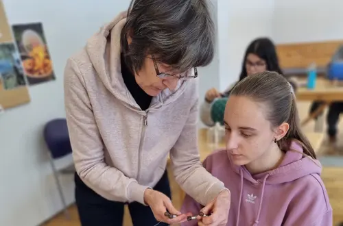 Die Schüler:innen konnten sich bei verschiedenen Stationen zuteilen: Seifen und Salben herstellen, Mosaikkugeln gestalten, Sticken lernen und üben. Das kreative Arbeiten machte allen sichtlich Spaß.