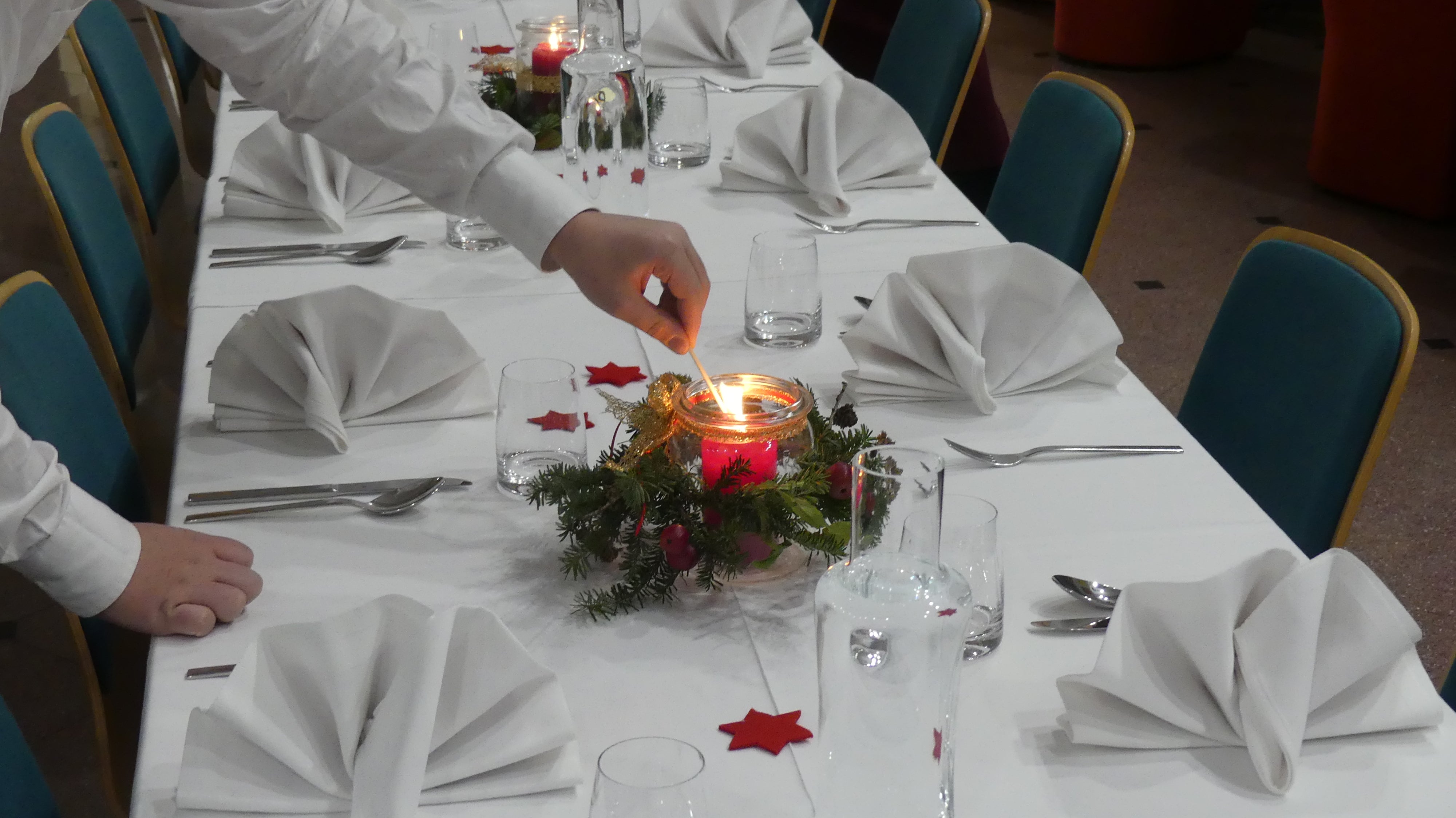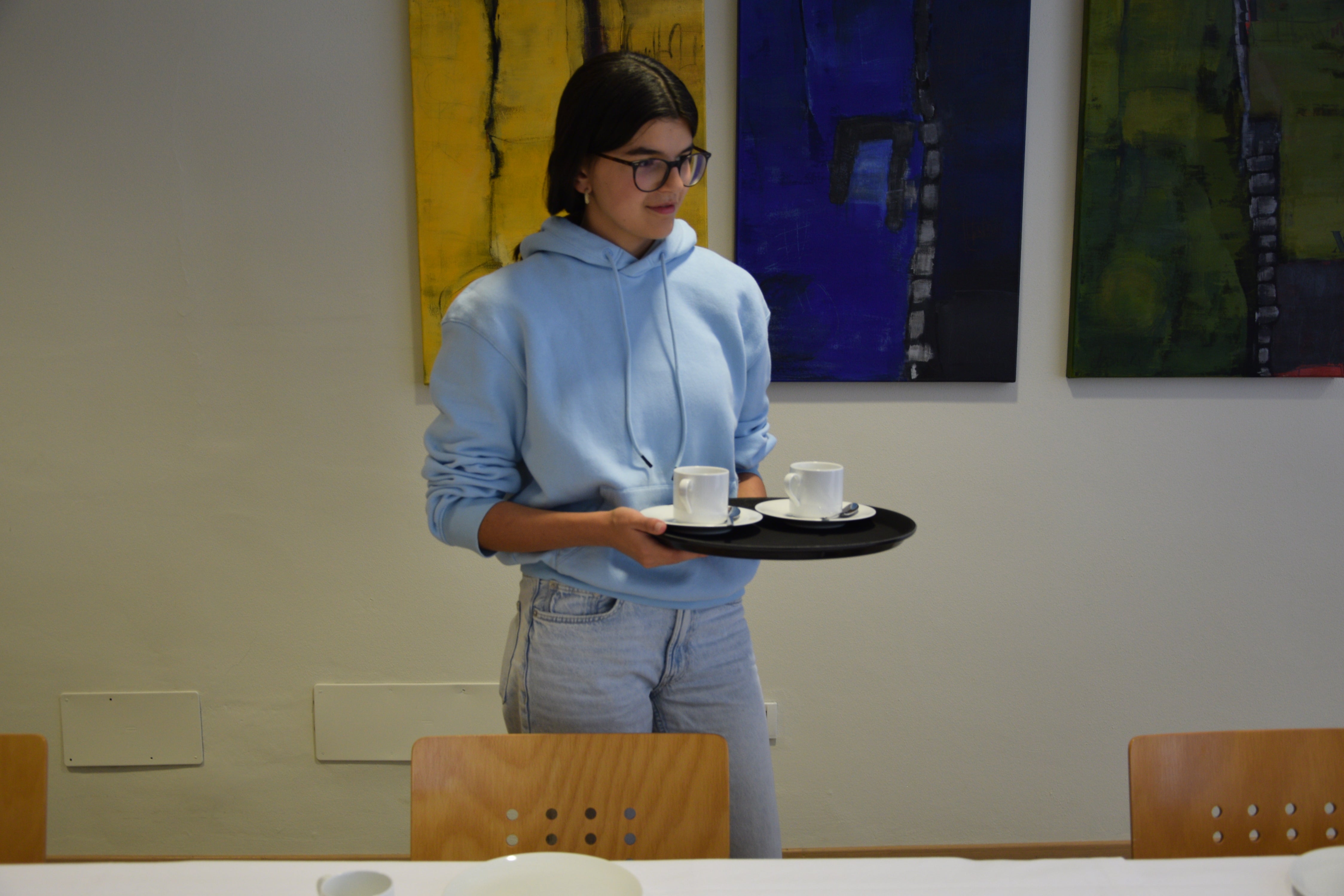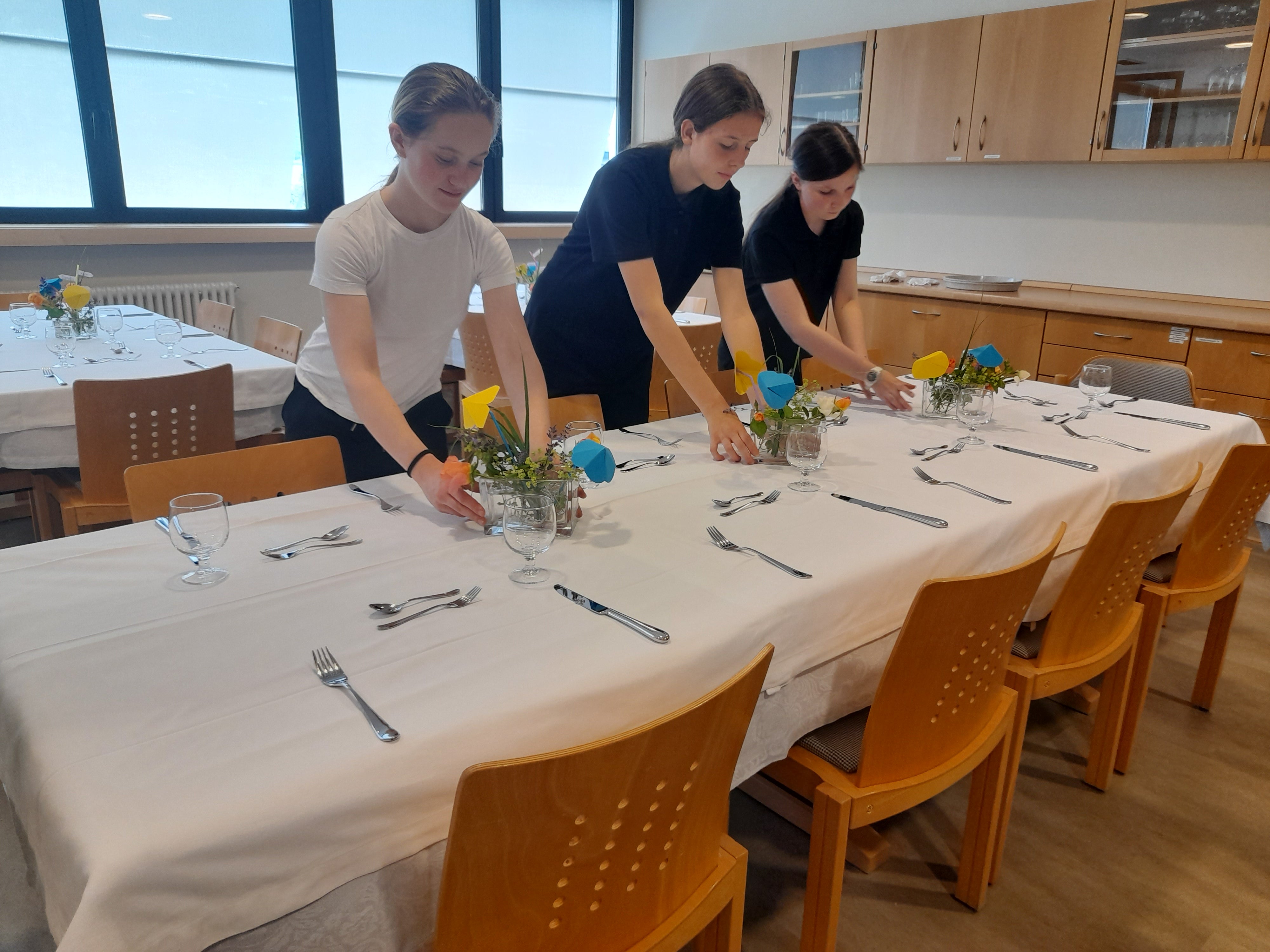Anfang Dezember waren die Eltern und Lehrpersonen der 1. Klasse zur Adventfeier eingeladen. Die Schüler:innen verwandelten die Eingangshalle in einen feierlichen Saal mit schön gedeckten Tischen, Tischdekorationen und servierten selbst gemachte Köstlichkeiten.